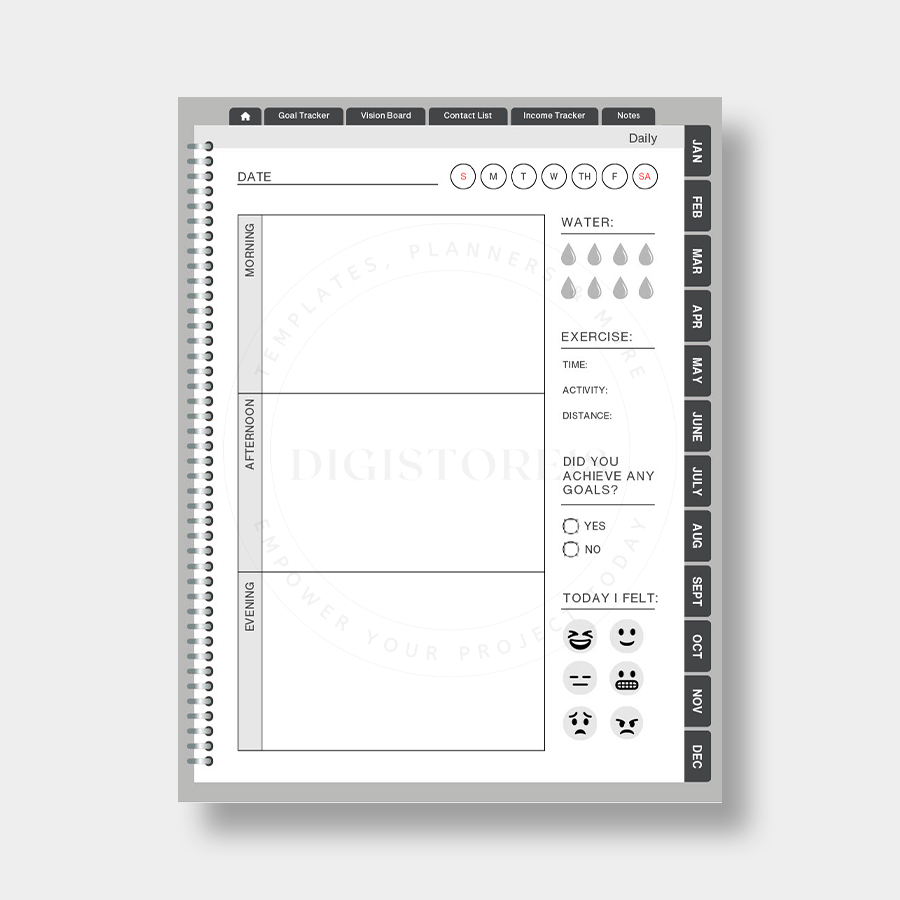 The comprehensive layout includes 12 classily designed monthly overview pages, 52 detailed weekly spreads, and 365 individual daily pages featuring structured sections for morning intentions, afternoon progress, and evening reflections. Track your fitness journey with dedicated exercise logs, monitor your emotional well-being with mood tracking, and stay focused on what matters most with integrated goal-setting sections.